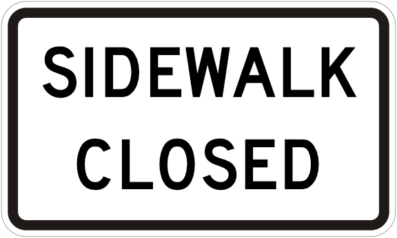 At the sidewalk closure point, there is an acceptable barrier but no signage. At this point, it looks like there could be a bypass, but it is fenced off. The appropriate sign here is MUTCD R9-9.