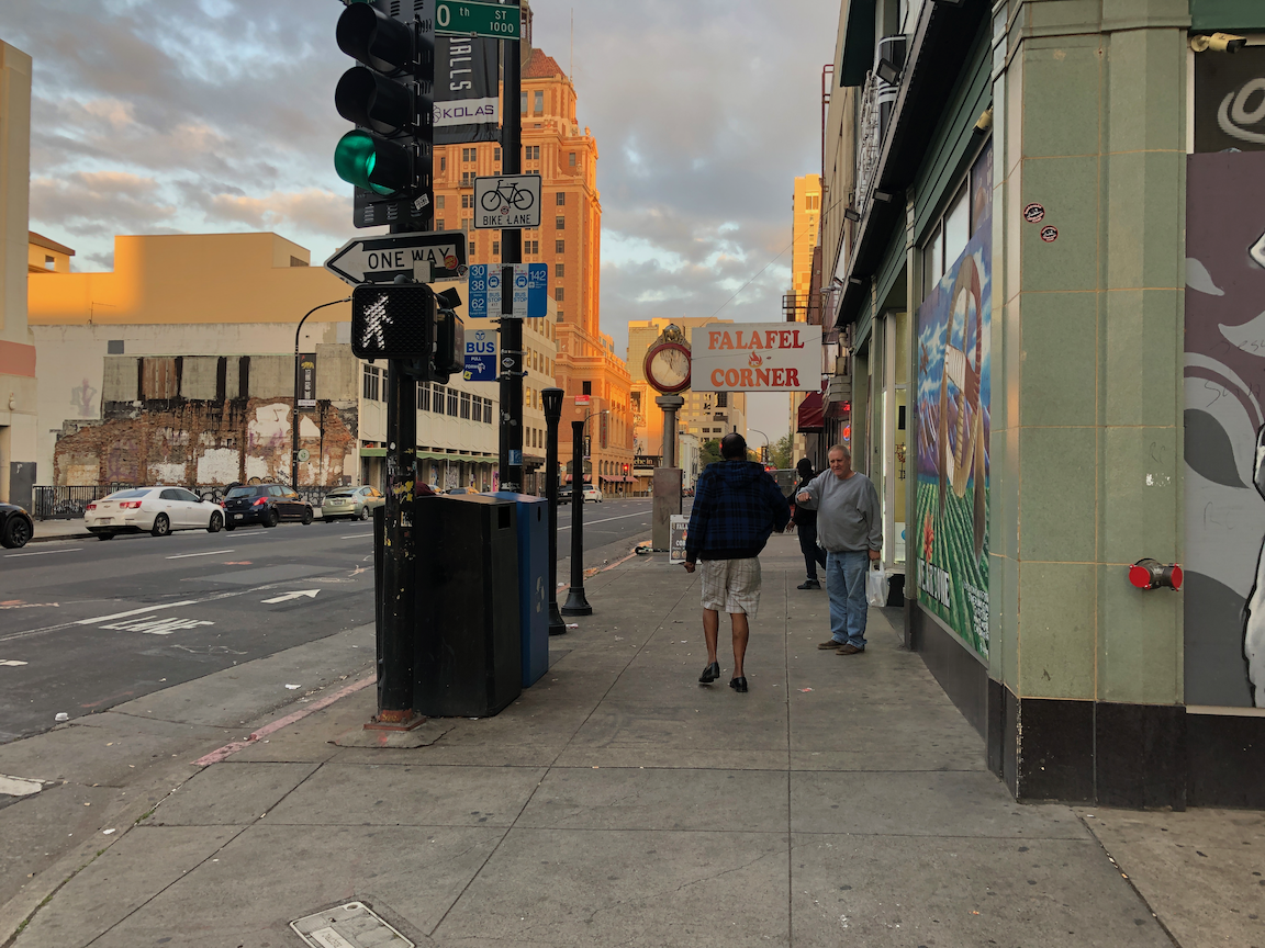 For a person walking north or south on the east side of 3rd Street, there are five crosswalks to navigate just to cross J Street. You can see in the photo that they are not well maintained, quite faded, low visibility crosswalks that many drivers would not even notice. Each crossing requires pushing a button, and since freeway off-ramp traffic is prioritized, each signal cycle is quite long. (For those counting, the reason I call this five crossings is that the crossing of 3rd Street on the south side had a short pedestrian cycle which was less than required by MUTCD and certainly less than should be available to walkers, so for most people, it had to be crossed in two stages, making for an even longer time to clear the intersection. Of course with no ped button on the median, one the second crossing just has to be done in a gap in traffic, against the signal.)