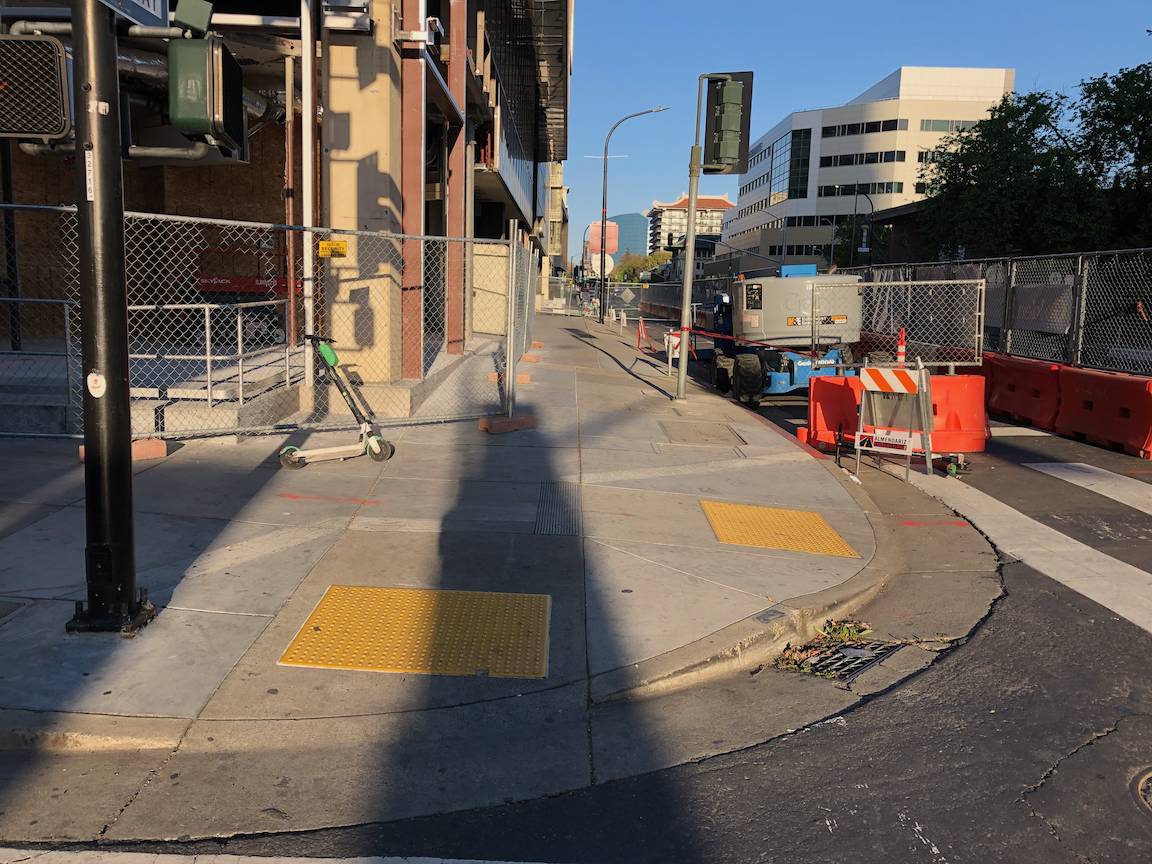3rd St & J St, southwest corner, sidewalk closed but no warning