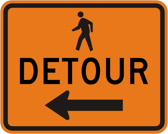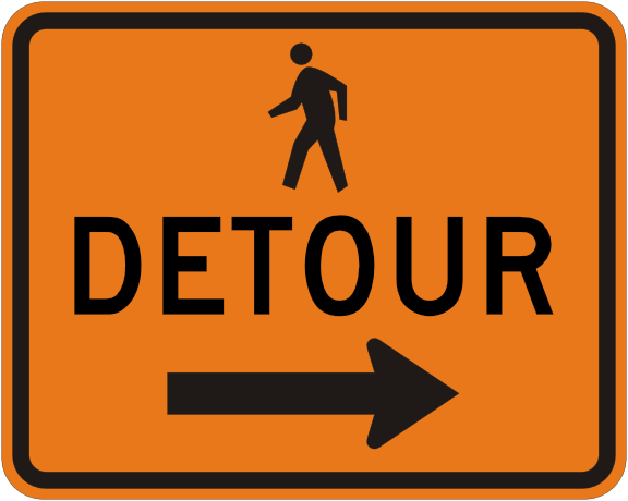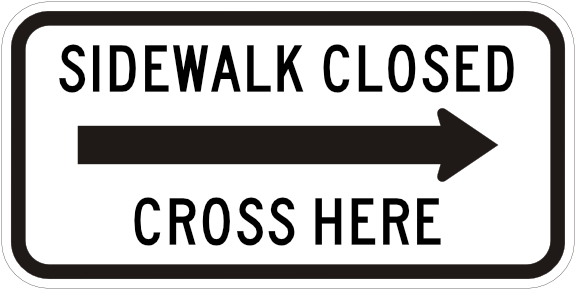 Note: I have modified the presentation of signs here, using two slideshows: Temporary Traffic Control (TTC) signs M (orange), and regulatory signs R (white). MUTCD R9-10 is not a favored sign because it gives no indication about what the most direct route for a walker is.