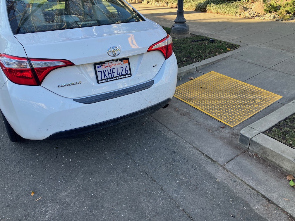 An example. I reported this illegally parked vehicle at 9:17AM. It was blocking the crosswalk over 13th St, and the ADA ramp. The remaining ramp area was not wide enough to allow a wheelchair to pass. At 11:09AM I received an email reply from the city, stating: “A Parking Enforcement Officer arrived at P ST & 13TH ST, SACRAMENTO, 95814 to find that the vehicle(s) reported were no longer on the scene.” At 7:30PM, the vehicle was still in exactly the same place. The officer was lying. The vehicle was still there. Either the officer never visited the location, or decided not to cite the vehicle.