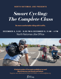 Jibe (formerly North Natomas TMA) is hosting two Smart Cycling (Traffic Skills 101) courses, in December and January, and a League Cycling Instructor (LCI) Seminar in February. If you are interested in working with youth for Jibe and other regional programs, or being a bicycling instructor, check the flier and position announcement, and sign up now! Yours truly is a LCI who leads the bicyclist education program in San Juan Unified School District, and cannot speak more highly of this opportunity. Go for it!