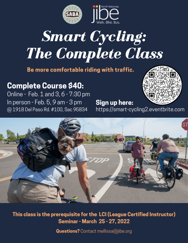North Natomas Jibe, Sacramento Area Bicycle Advocates (SABA) and other partners are offering a Smart Cycling class in the Sacramento area on February 1 and 3, evening ‘classroom’ presentations through Zoom, and an in-person field day on Saturday, February 5, for parking lot skills and road skills.