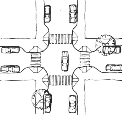 • Daylighting intersections. This means removing parking from within 15-20 feet of the crosswalk or stop bar, either by painting and enforcing red curbs, or building curb extensions (bulb-outs) at every intersection. Upstream, approaching the intersection, is the big safety feature, downstream, leaving the intersection is much less important. There are interim solutions here, such as painting curb extensions and using soft-hit posts (vertical delineators).