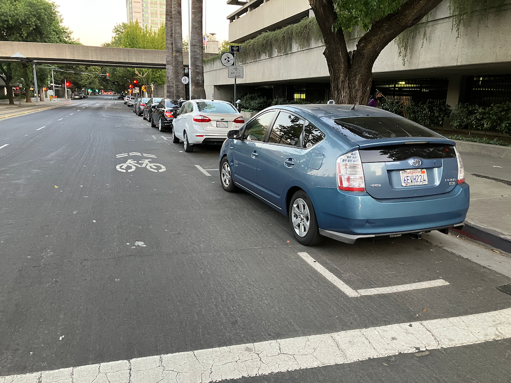 I am certain that all of these cars belong to county employees or contractors. They should be parking in the garage, and this parking should be removed so that at least a marked bike lane can be placed in this block. Of course H Street should have a separated bikeway from 6th Street, Sacramento Valley Station, to 16th Street, where it becomes two-way. But a Continous painted bike lane is at least a first step.