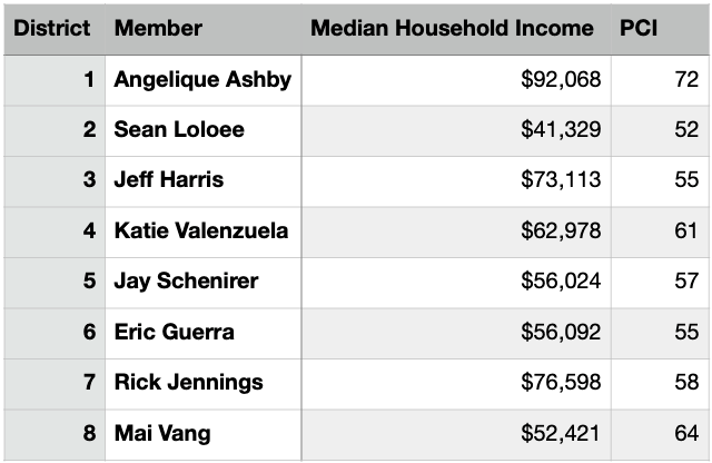 The report has maps for each council district, showing the PCI for each (PCI = pavement condition index, a measure of how well the roadway has been maintained, higher is better). I wondered whether the PCI correlated with income, as many things do, so I plotted 2020 median household income of each district against PCI, table and chart below.