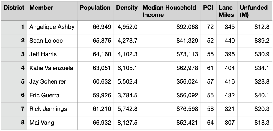 And finally, here is my current data table, in case you want to play with data or suggest insights. Note that the population of each district is roughly the same, as it should be. The unfunded column is the amount (millions of dollars) of backlog, to bring roadways up to PCI 75, but it does not include the ongoing yearly expense of maintaining them at that level.