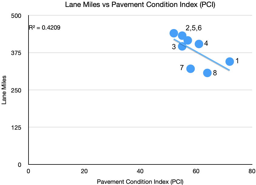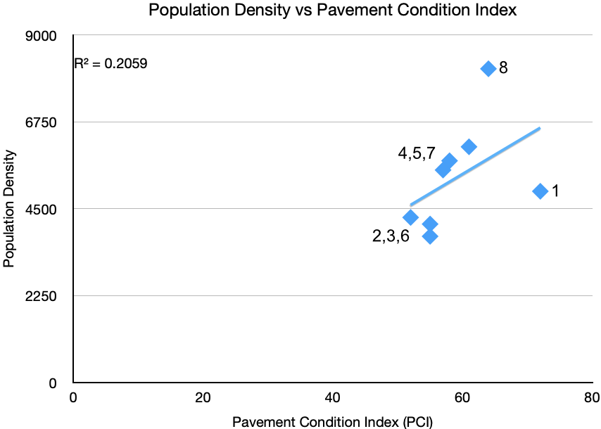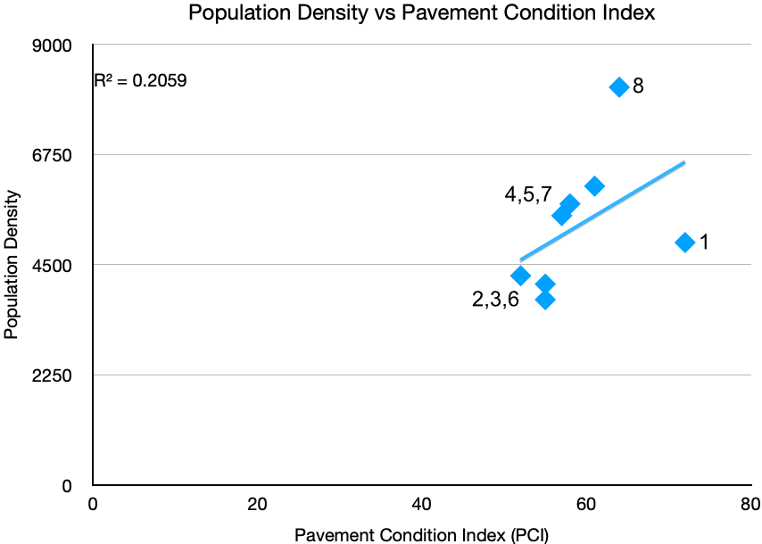 There is not a strong correlation between income and PCI, R = .42, but district 1 and 2 are clear outliers, with 1 being the highest income and highest PCI, and 2 being the lowest income and lowest PCI. The city report says that the reason district 1 has a high PCI is that the roads there are newer, but I’m a little doubtful this explains it all, since many of the roads in that area are now old enough to need maintenance.