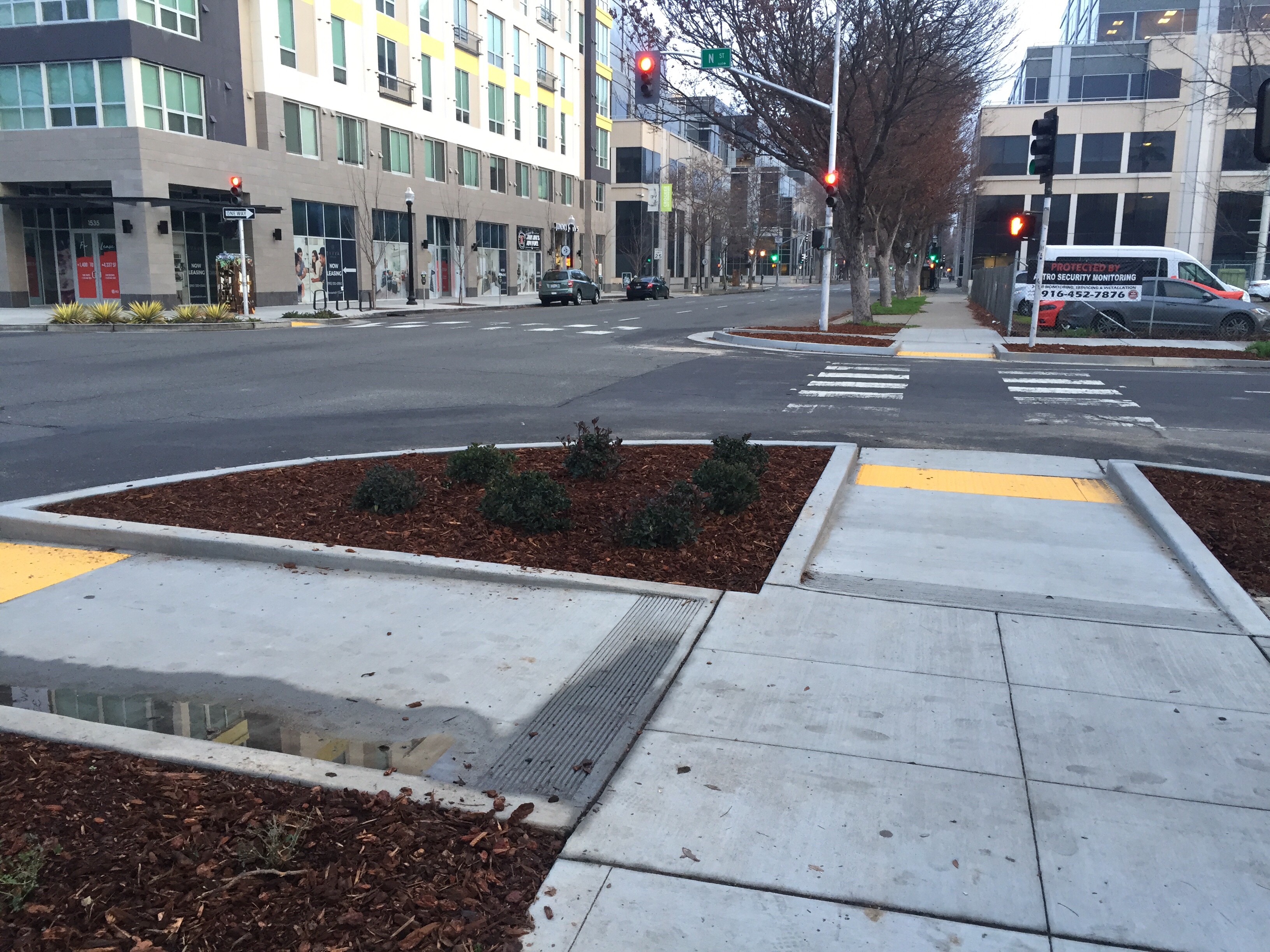Curb extensions, also called bulb-outs, have been installed on all four corners at the intersection of 16th Street and N Street in midtown Sacramento. The extensions are the width of the parking lanes along both these streets. N Street has bikes lanes, which are not restricted by the extensions, while 16th Street does not have bike lanes, and won’t until the street is reconstructed into a more complete street at some unknown point in the future.