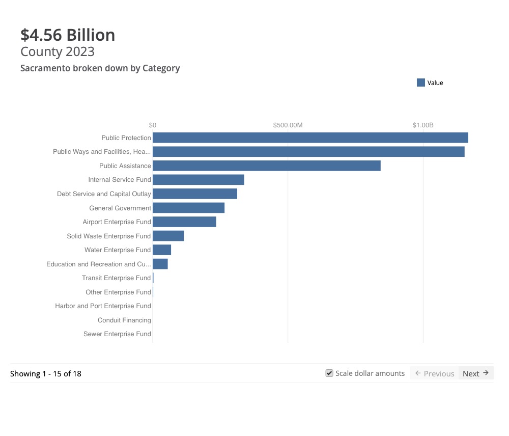 Two other types of tax which are progressive, meaning that high-income people pay a higher percentage of income than low-income people, are income tax and property tax. Income tax does fund transportation at the state level, but income taxes are not available to cities, counties, and special districts. Property tax can fund transportation, though due to Prop 13 which limits property tax, it mostly goes to schools and public safety. For Sacramento County in 2023, the chart below shows allocations. The ‘Public Ways and Facilities, Health, and Sanitation’ category goes mostly to Health, with Public Ways and Facilities being less than 20% of that category. This chart does not include school districts within the county, which also rely on property tax.