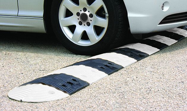 Nothing has changed about the ‘turn wedges of death‘. A closer look at the design diagrams (thanks to the person who provided them) shows that the wedges at intersections of the separated bikeways are intended to have hard curbs, 4 inches with sloped sides (regular curbs are six inches or more) with stamped concrete interiors (style 3), but the other intersections will have ‘rubber speed bumps’, and vertical delineators. The bumps are apparently as shown in the photo below, though the photo shows a bump in the travel lane, and these are in the turn wedges. The bumps are 2.25 inches high, which won’t be even noticed by trucks and SUVs, though might be noticed and respected by passenger car drivers.