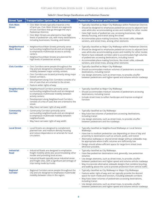 Portland (PBOT) uses a street classification system with eleven street designs, which are supplemented by five pedestrian classifications, four bicycle classifications, six transit classifications, and nine freight classifications. Yow! An advantage of the Portland system is that it includes details about each category, including land use, lanes, width, function, curb zone, separation, design elements, design treatment, and utilities. The Pedestrian Design Guide, simplifies down to eight classifications, shown below (pdf).