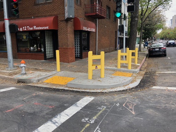 Why? Well, the primary reason is that this is the intersection of two 3-lane, one-way arterials, both of which are known to have a history of speeding. The city installed a speed display sign on 12th Street approaching I Street, but has not done so for I Street approaching 12th Street. I had not noticed this sign before yesterday, so I don’t know how long it has been there. Even a brief watch of it indicated that many drivers are exceeding the speed limit, some egregiously so, at more than 10 mph over the speed limit. And then, of course, there are the bollards pictured above. These are not solutions.