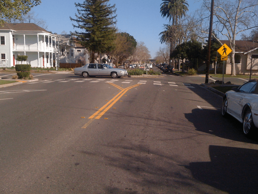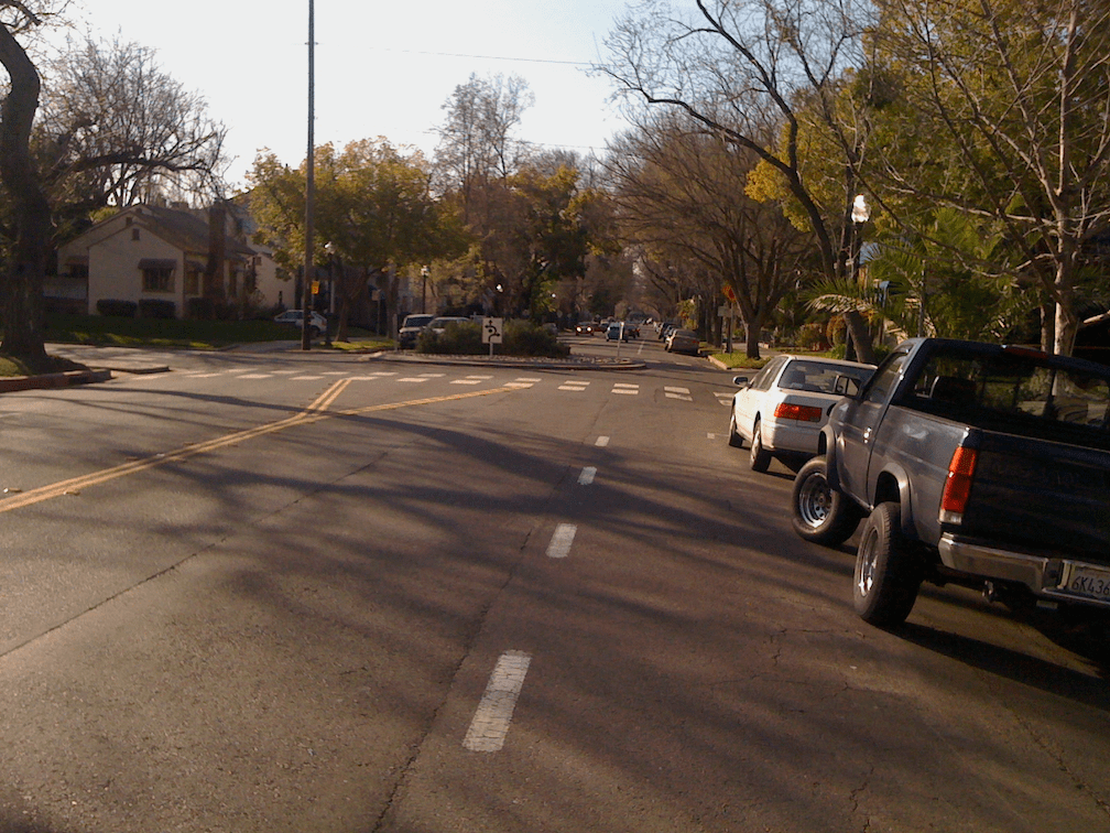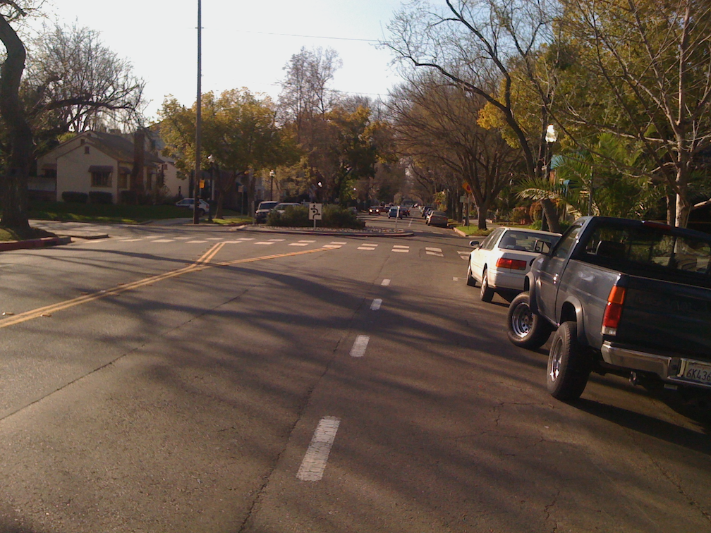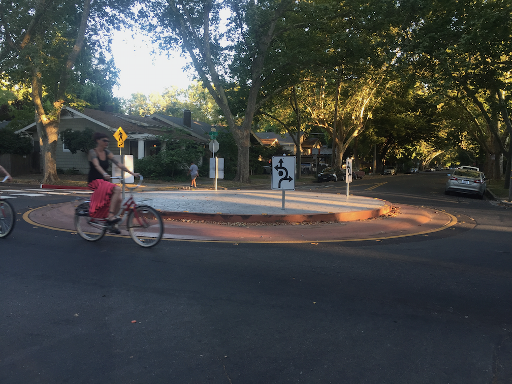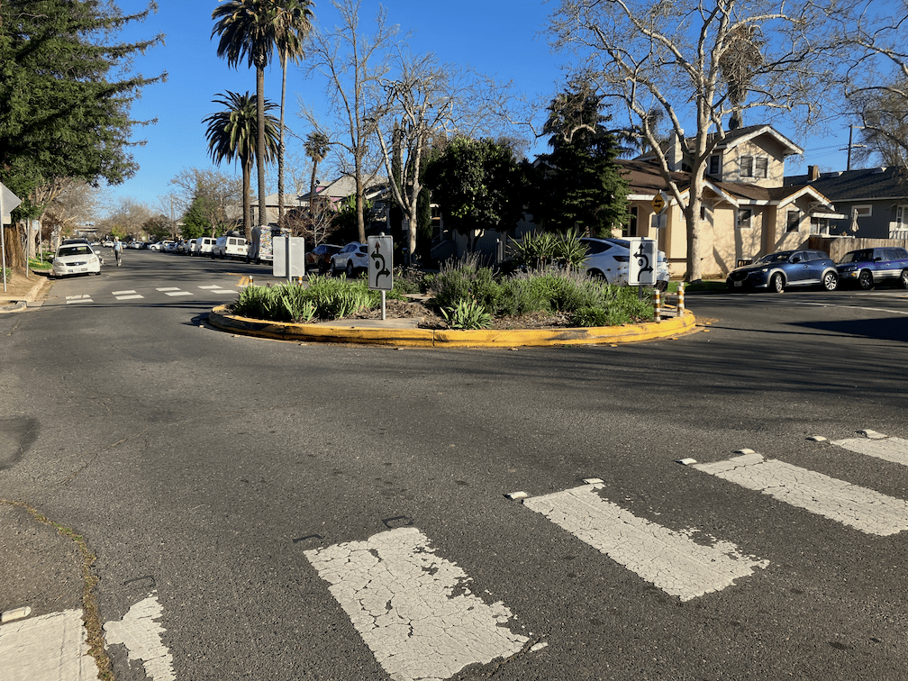 There are a a number of traffic circles in Sacramento central city, most of which were put in years ago, but a few newer ones also exist. Depending on the size of the circle, they have varying traffic calming benefits. The reason traffic circles are used instead of roundabouts is that you can’t just plop a roundabout into the footprint of an existing urban intersection. They require more space.