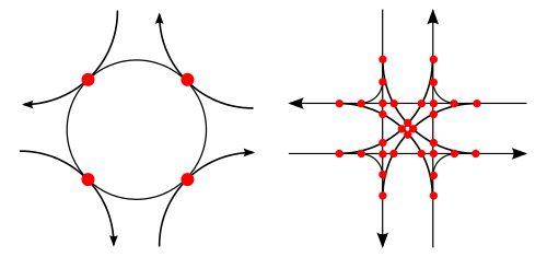 A modern roundabout is a structure that allows a free flow of traffic without stop signs. Instead, they use yield signs and markings. They are most appropriately used at street intersections where both streets are fairly busy. The biggest advantage of a roundabout, for all users, is the reduction of conflict points in the intersection from thirty-two to four, as illustrated in the diagram at right!