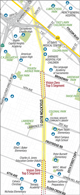 The City of Sacramento is undertaking a Stockton Blvd Corridor Study, covering the section between Alhambra Blvd and 47th Ave / Elder Creek Rd, but focused on the two high injury segments around Broadway to 14th Ave and north of Lemon Hill Ave to south of 47th Ave / Elder Creek Rd. Map below.