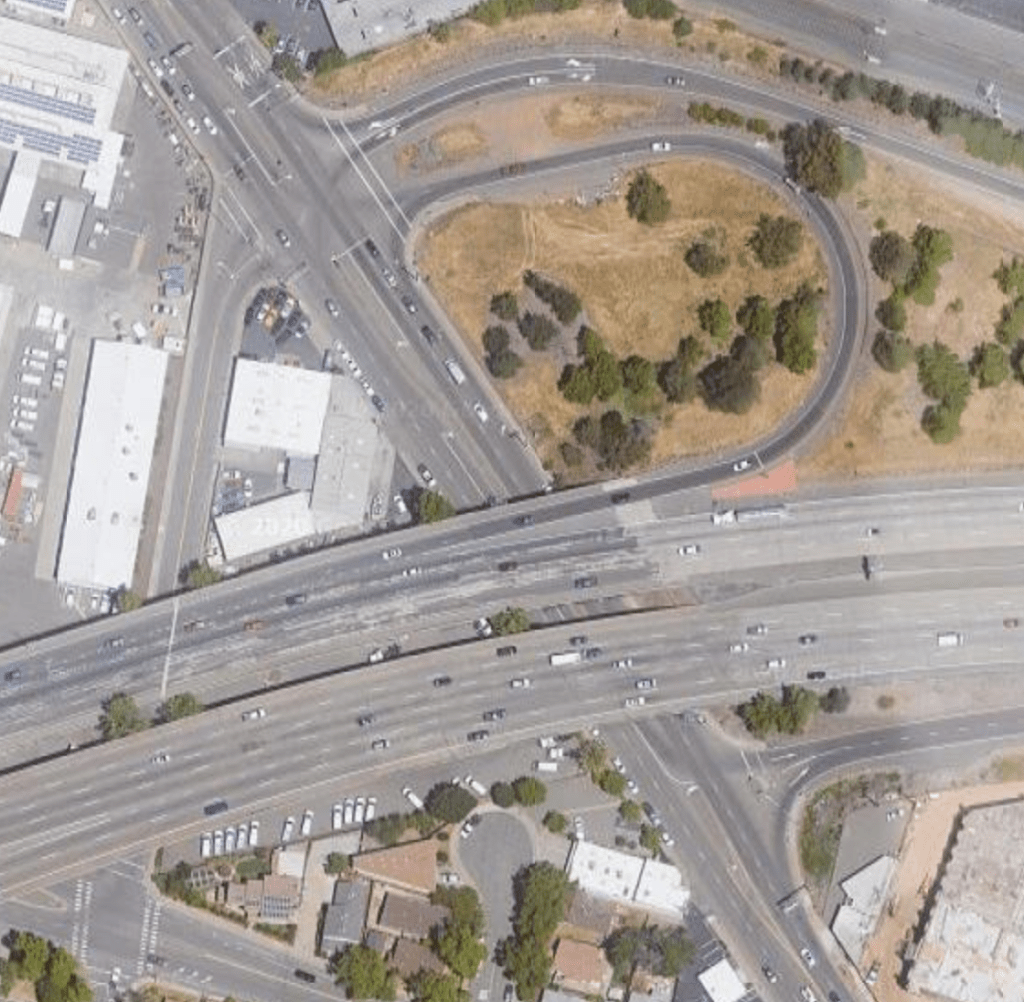 The Hwy 50 and Stockton Blvd interchange is problematic for both walkers and bicyclists. There are no bike lanes through this section, at all, and walkers on the east side of Stockton face long crossing distances in a design that strongly favors high speed motor vehicle drivers. In the photo below, look at the long crossing distance on the north side of the freeway, of the exit and entrance ramps. It’s about 120 feet, with no protection from drivers, at all. I have both used and observed this crosswalk, and can confirm that very few drivers yield to walkers in the crosswalk. It is a guaranteed death trap for walkers.