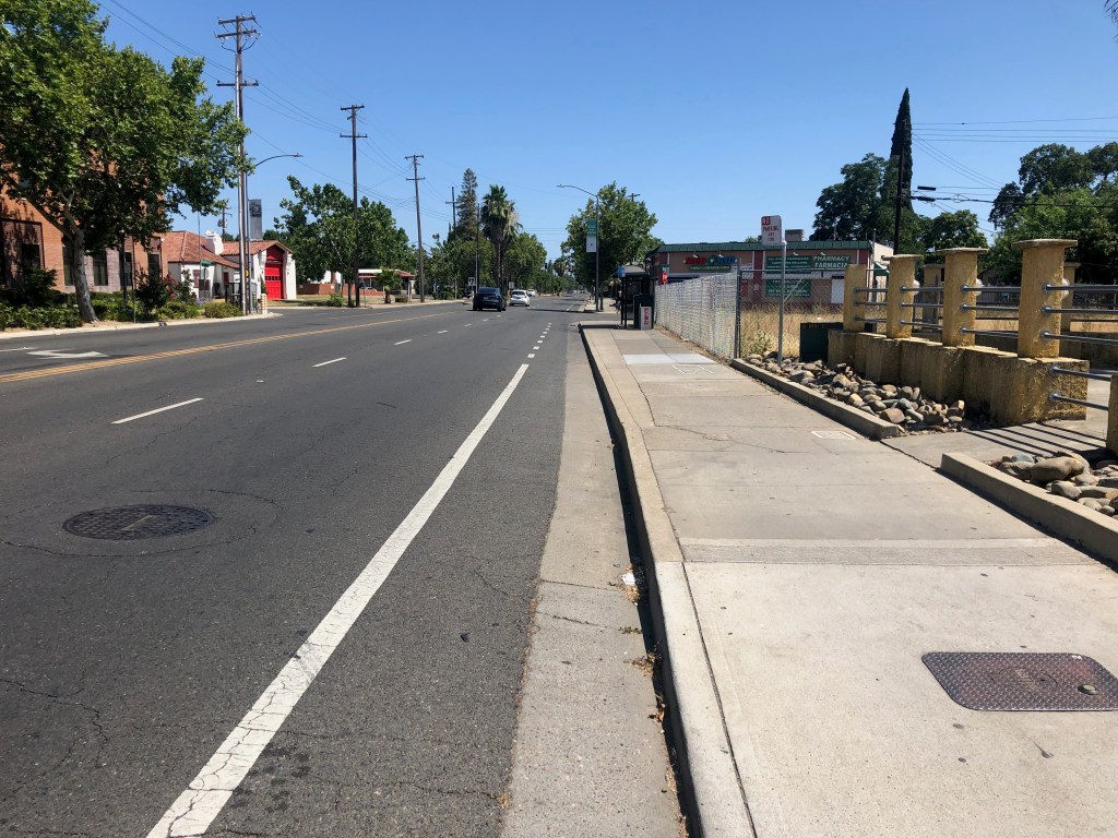 At the major intersections, where crosswalks are present on all legs, the crossing distances are long. Though not as bad as many other locations in Sacramento, intersections are often flared out to add turn lanes, both left and, often, right turn lanes. This increases crossing distance. This issue can be solved in two ways: removing the unnecessary turn lanes, or adding pedestrian refuge islands in the middle, so that slower walkers can make the crossing in two stages. The medians must be six feet wide, to meet standards, and must have a pedestrian button so that people don’t become stranded. (Note: I’m not in favor of pedestrian buttons at all, except when they: 1) trigger audible information, or 2) lengthen the crossing time; however, this is one situation in which they make sense)